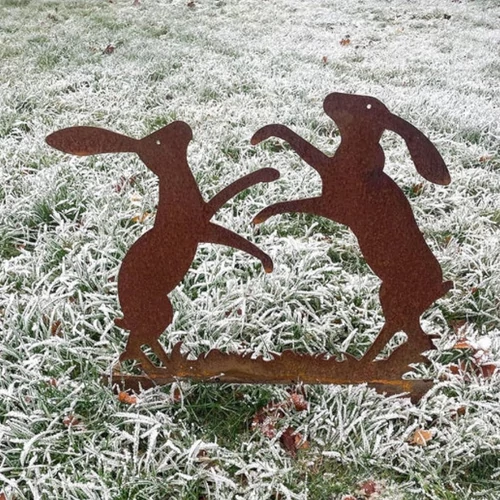 Téma és Hangulat: Két, hátsó lábán álló nyúl, intenzív, mozgalmas pózban. Tökéletes udvar, terasz és vintage kerti dekoráció a természet szerelmeseinek.